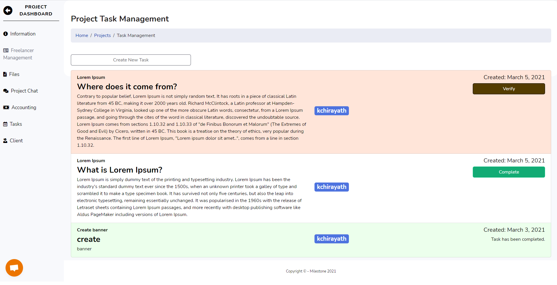 Create and confirm tasks for each project you create. Agency users have the ability to assign tasks to their freelancers and sign off on tasks freelancers mark as completed.